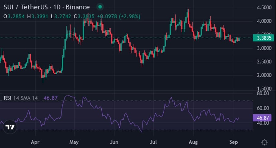 SUI торгуется в диапазоне от 3,06 до 3,59 долларов после нестабильной недели, что принесло снижение на 3,02%. Ежемесячная динамика показывает умеренное снижение на 0,75%, в то время как через 6 месяцев постоянное увеличение на 36,57%. 10-дневная средняя цена в 3,36 долл. США превышает 100 долл. США в 3,30 долл. США, что указывает на долгосрочную тенденцию к повышению, несмотря на недавнюю консолидацию.