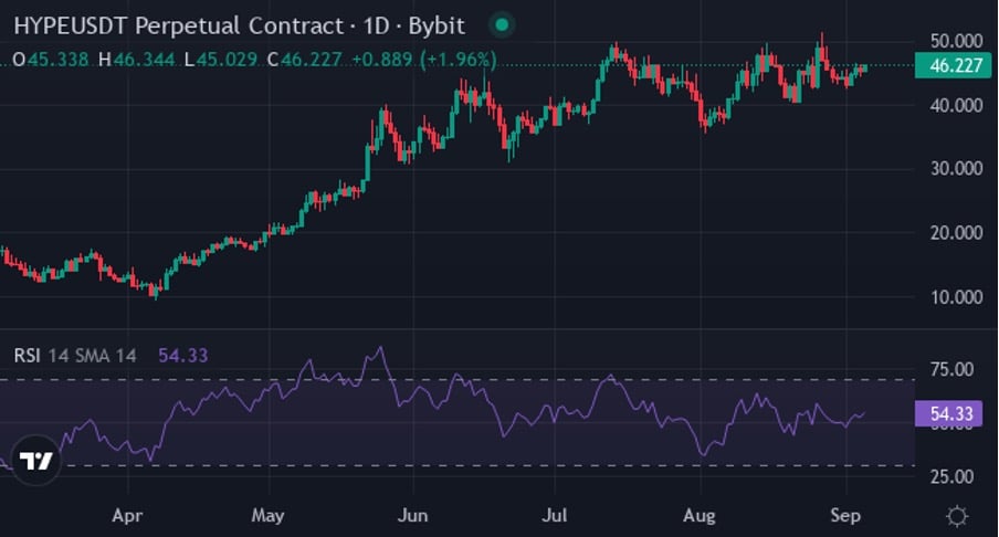 Торговля ажиотажем в диапазоне от 40,72 до 49,49 долл. После стабильной недели, которая принесла 1,49% прибыли. 10-дневное среднее составляет 45,76 долл. США, что почти соответствует 44,98 долл. США, что указывает на консолидацию, а не направленную предвзятость. Технические показатели предоставляют неоднозначные сигналы, хотя основной импульс сохраняет конструктивную тенденцию.