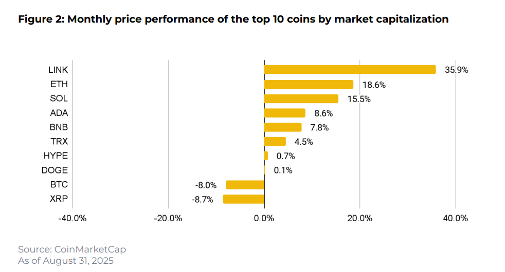 Август подтвердил переход от биткойнов к альткойнам, включая ETH и Link, в то время как Steiblcoins и Defi становятся ключевыми драйверами рынка. Следующий месяц покажет, сможет ли криптоэкосистема поддерживать импульс, несмотря на сезонную волатильность.
