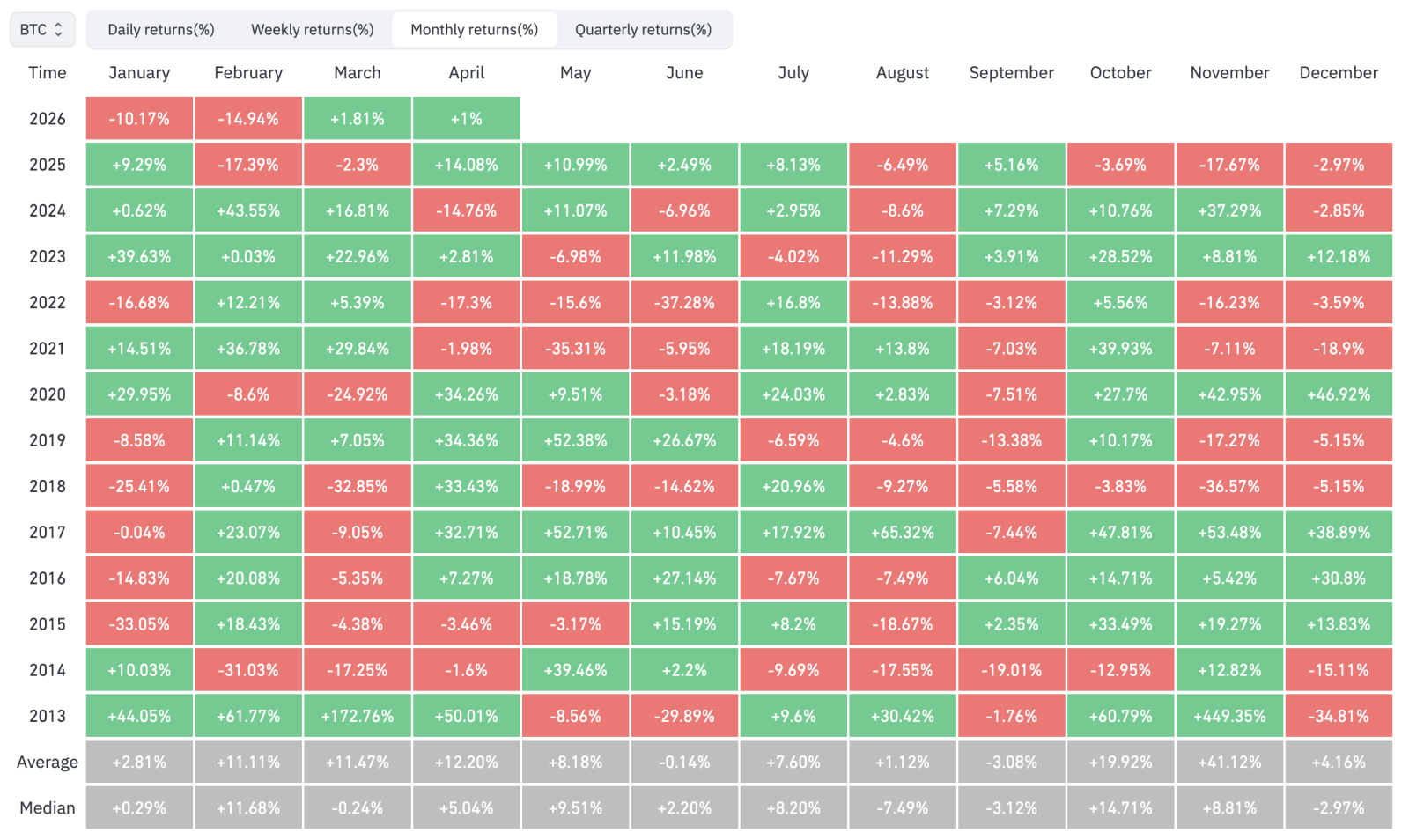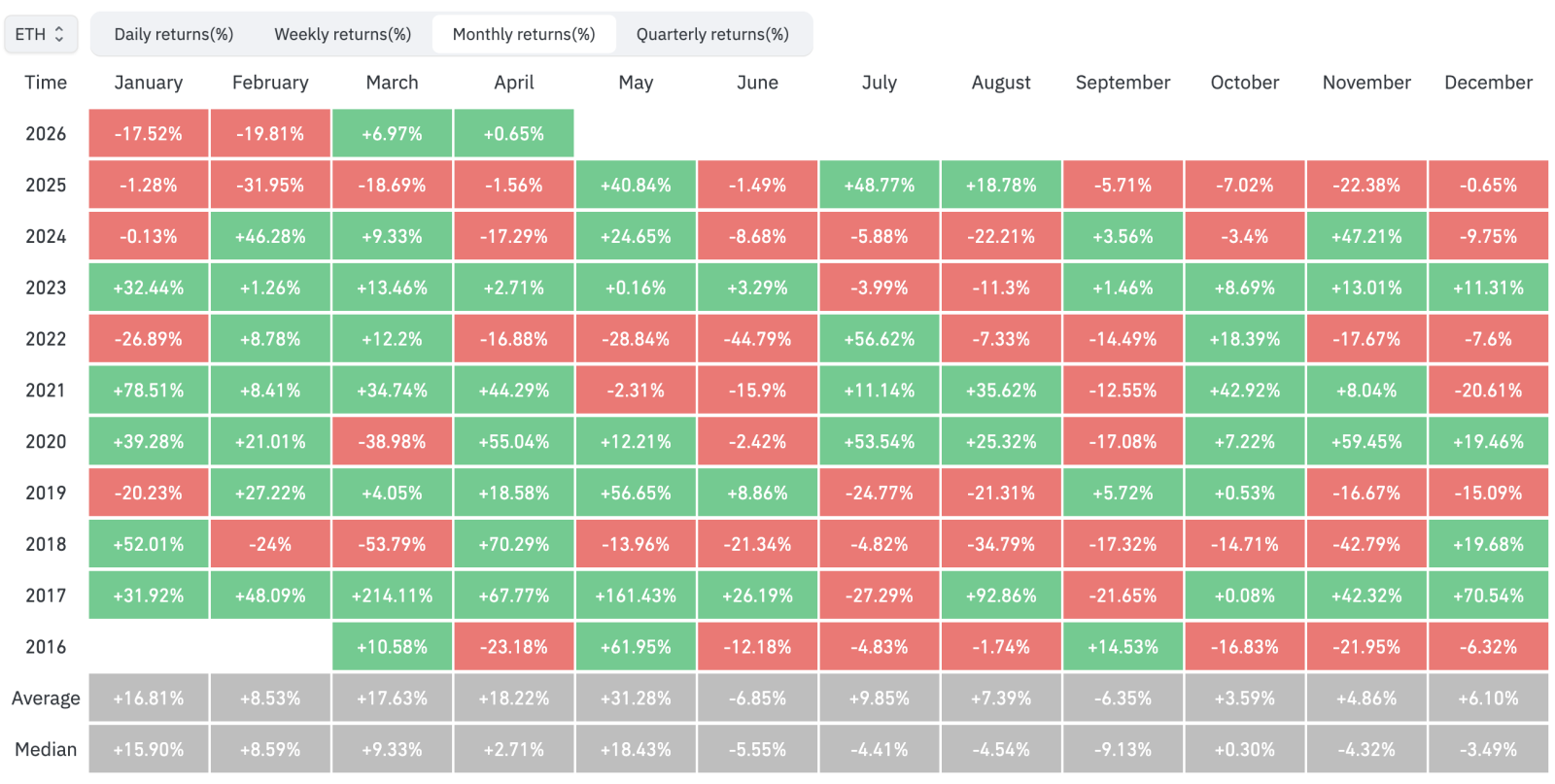 Март остается для крипторинки месяцем контрастов. Худшим мартом для биткоина был 2018 год (-32,8%), а лучшим — 2013-й (+172,7%). Для Ethereum рекордный мартовский рост произошел в 2017 году (+214,1%), а самый большой обвал — в 2018-м (-53,8%).