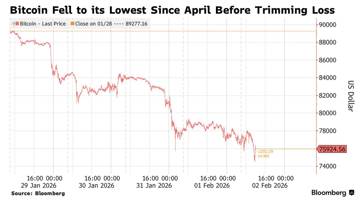 Биткойн упал до 10-месячного минимума (~ $74,5 тыс.) на азиатских торгах после распродажи на выходных на фоне общей турбулентности рынка. Об этом пишет Bloomberg.