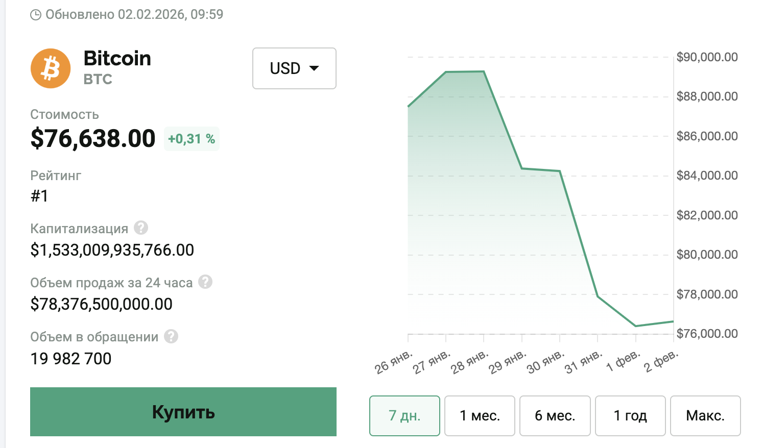 Согласно интерактивной таблице Минфина, по состоянию на 10:00 стоимость биткойна составляет $76 638 за монету.