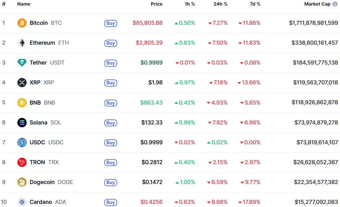 На момент написания биткойн торгуется на уровне около 85 805 долларов. «Цифровое золото» потеряло за день 7,27%, за неделю — 11,86%.