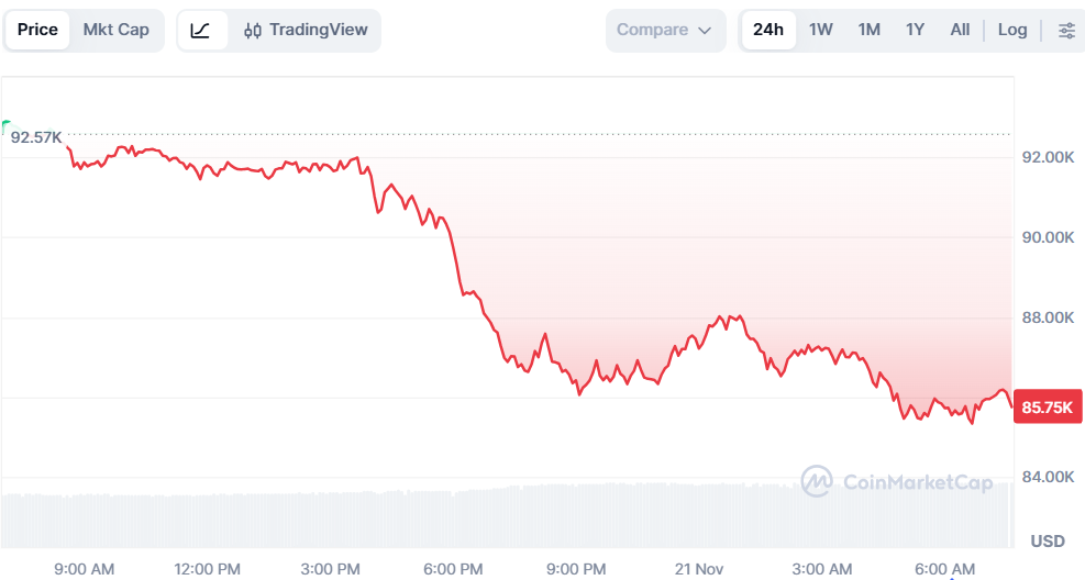 Сегодня утром, 21 ноября, цена первой криптовалюты упала до $85 338, а Ethereum – до $2781. Об этом свидетельствуют данные CoinMarketCap.