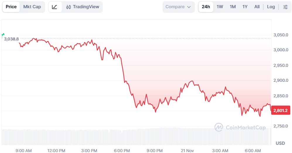Цена Ethereum на данный момент составляет 2805 долларов. За последние сутки актив снизился на 7,5%, а за неделю потерял 11,83%.