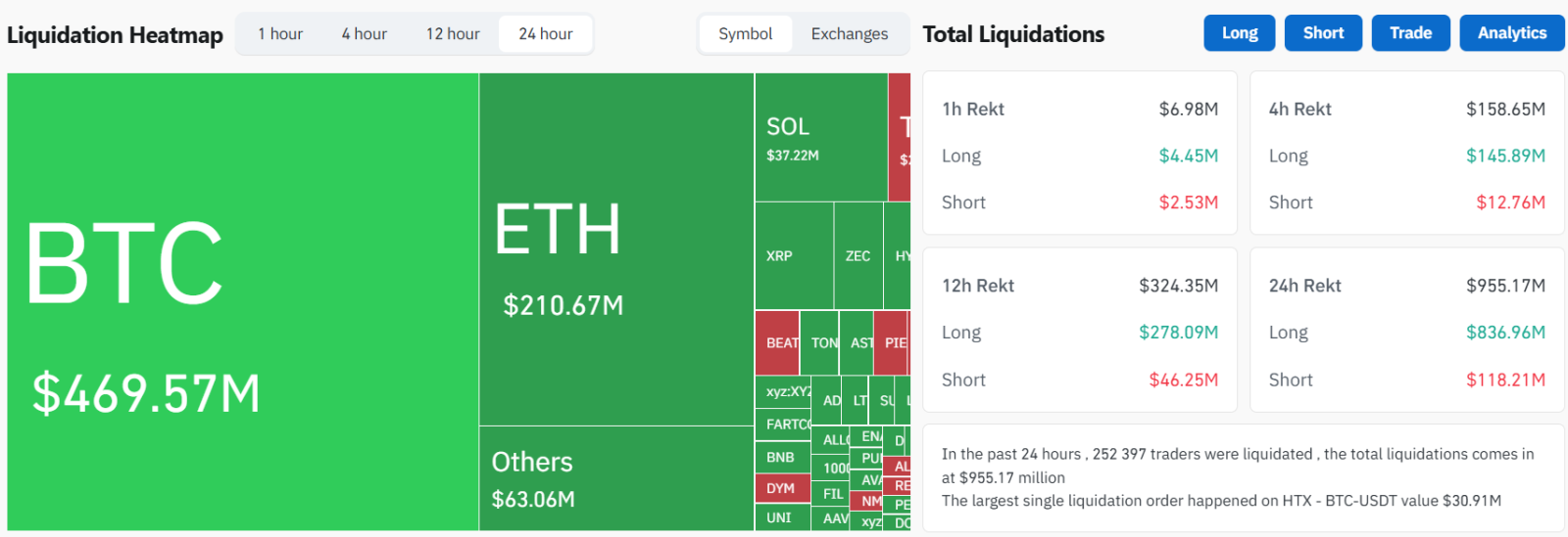 За последние сутки на крипторынке были зафиксированы ликвидации, общая сумма которых составляет $955 млн, затронувшие более 252 тысяч трейдеров. Об этом свидетельствуют данные CoinGlass. Подавляющее большинство этих потерь пришлось на длинные позиции: