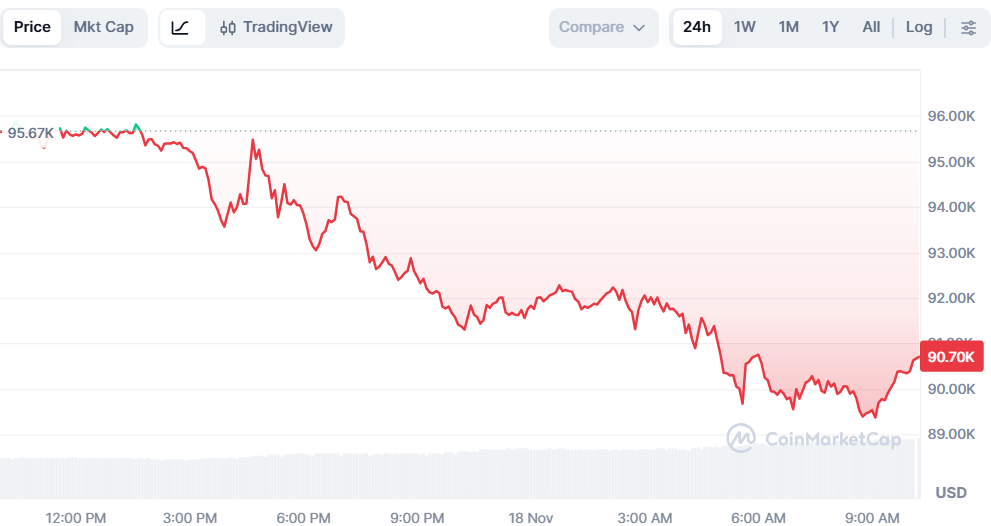 Сегодня, 18 ноября, курс первой криптовалюты упал ниже $90 тысяч, а Ethereum — до $3000. Об этом свидетельствуют данные CoinMarketCap.