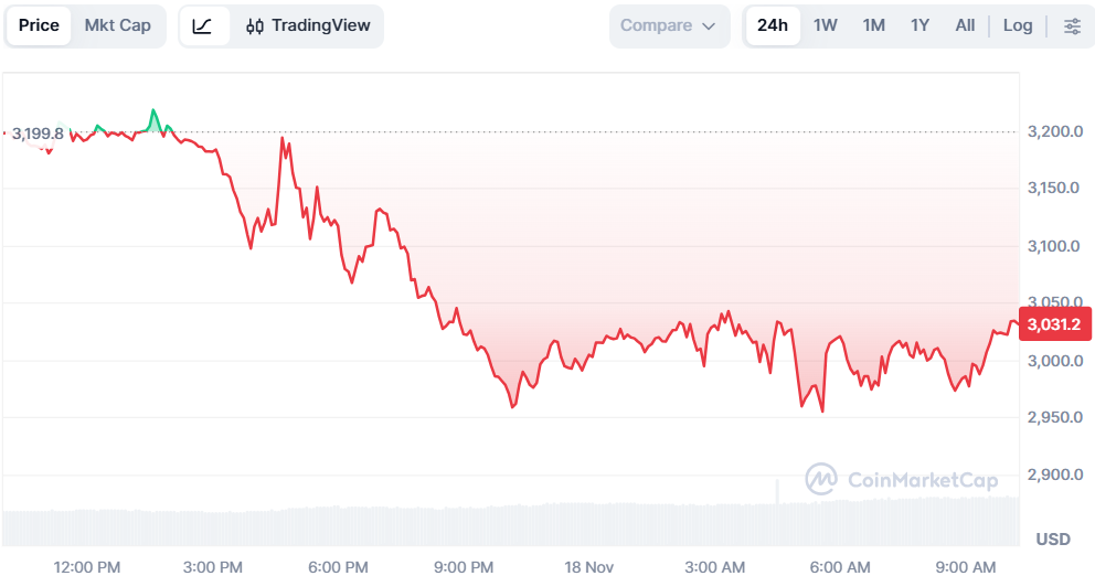 На данный момент Ethereum упал до $2955. Позже оно выросло до 3041. Падение за последние 24 часа составляет 4,61%, а за неделю — 14,39%.
