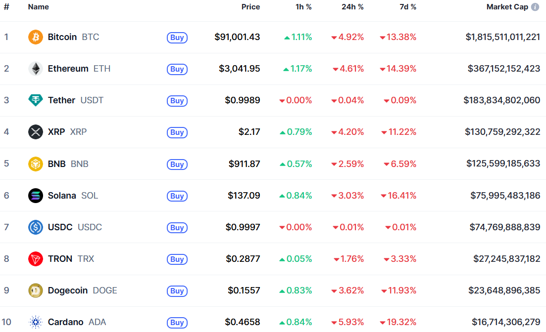 Утром биткойн упал до $89 368. Но потом немного восстановилось. На момент написания актив торгуется по цене $91 000. Биткойн потерял 4,92% за день и 13,38% за неделю.