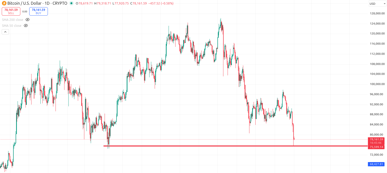 Падение котировок привело к знаковому событию: цена биткоина упала ниже средней цены покупки MicroStrategy в $76 037 за монету впервые с октября 2023 года.