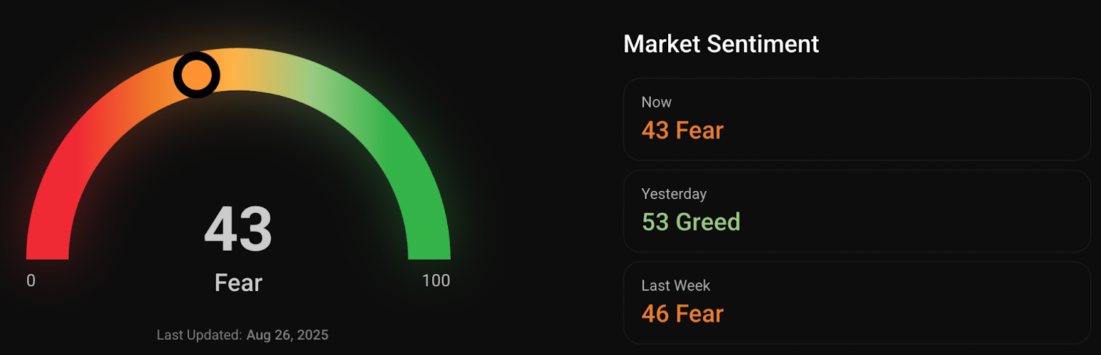 Падение цены также было отражено в рыночных настроениях: индекс страха и жадности уменьшился на 10 пунктов, достигнув отметки 43, что указывает на превосходство страха при криптовалюте.