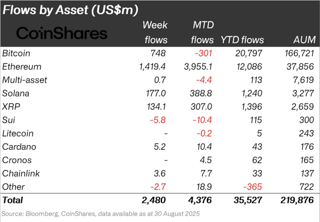 Основной поток средств в августе был нацелен на средства, ориентированные на Ethereum и Bitcoin:
