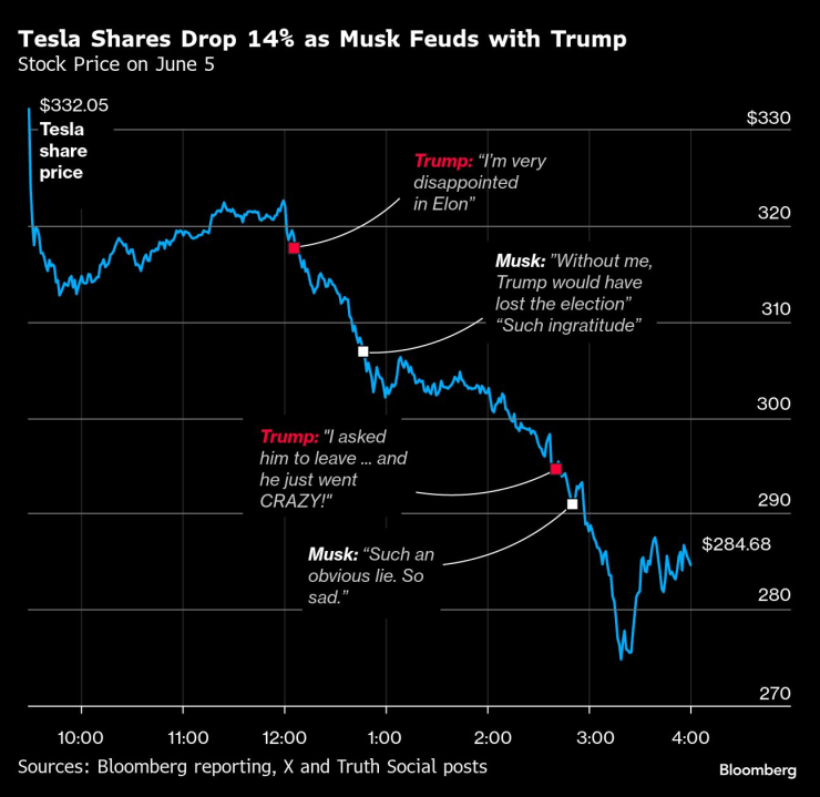 Акции Tesla падают на 14% из -за вражды между Маск и Трампом | Цена акций 5 июня