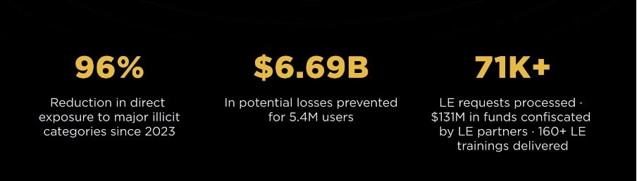 Один из самых «проверяемых» блоков отчета — метрики безопасности и соответствия требованиям. Сообщается, что с 2023 года Binance сократила свой прямой доступ к ключевым категориям нелегальных средств на 96%. В 2025 году меры контроля предотвратили потенциальные убытки в размере 6,69 миллиардов долларов США от мошенничества и мошенничества для 5,4 миллионов пользователей.
