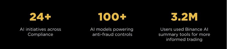 Согласно отчету, в 2025 году ИИ в Binance станет не «приложением», а частью базовой инфраструктуры с упором на управление рисками и формальную модель управления. Отмечается, что более 24 инициатив в области искусственного интеллекта были развернуты в соответствии с требованиями, а более 100 моделей искусственного интеллекта используются в целях борьбы с мошенничеством и мошенничеством. Эти системы принимают более 80% решений и помогают выполнять около 45% рабочих процессов, связанных с ручной проверкой. Для пользователей отмечен запуск инструментов AI-токенов и сводных отчетов: в 2025 году ими воспользовались 3,2 млн пользователей.