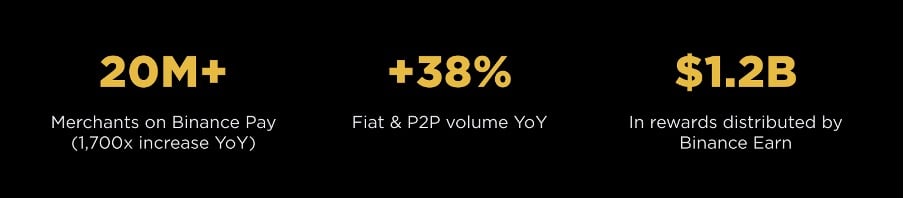 О Binance Pay: количество пользователей выросло на 30% по сравнению с прошлым годом, а количество продавцов увеличилось примерно с 12 000 до более чем 20 миллионов. В общей сложности с момента запуска Binance Pay в 2021 году было обработано транзакций на сумму более 280 миллиардов долларов; в то время как более 98% платежей B2C в 2025 году были осуществлены в стейблкоинах.