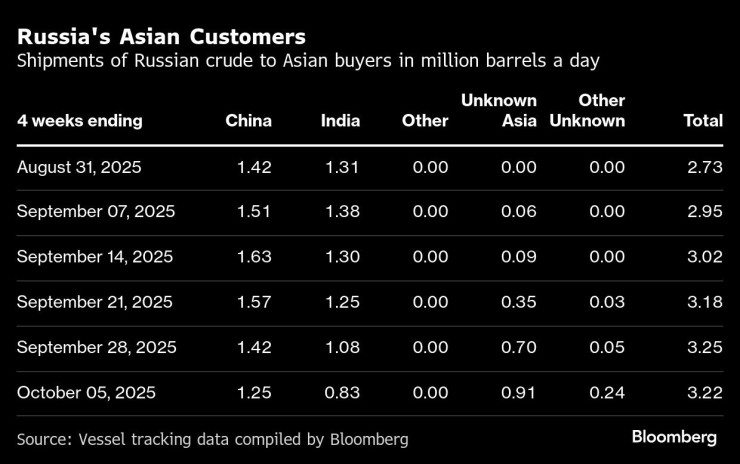Наблюдаемые поставки азиатским клиентам России, в том числе без конечного пункта назначения, снизились до 3,22 млн баррелей в сутки за 28-дневный период до 5 октября по сравнению с пересмотренными 3,25 млн баррелей в сутки за период до 28 сентября.