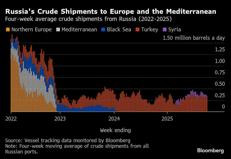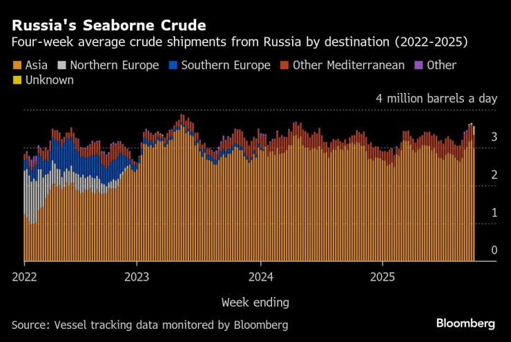 За последние четыре недели морские поставки сырой нефти из России задержались вблизи 16-месячного пика, поскольку украинские дроны на дронах нефтеперерабатывающих заводов вызвали необходимость перенаправления поставок на экспортные терминалы и загрузили их эффективные мощности.