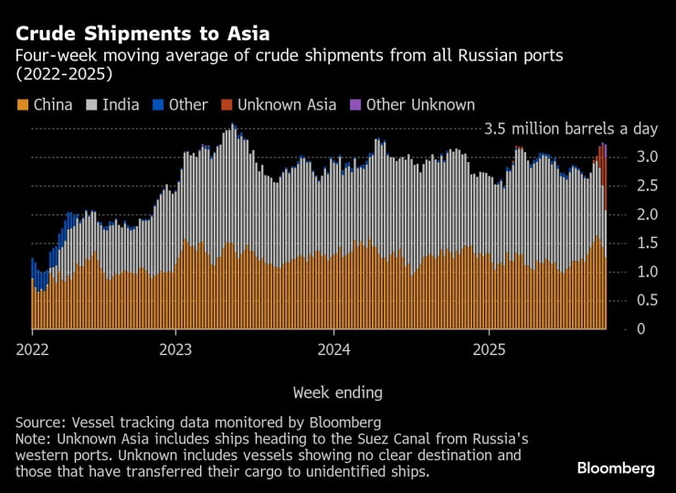 Из них около 910 000 баррелей в день приходится на суда из западных портов России, пунктом назначения которых является Порт-Саид или Суэцкий канал, или на суда из тихоокеанских портов без четкого пункта доставки, а еще 240 000 баррелей в день приходится на танкеры, которые еще не указали пункт назначения.