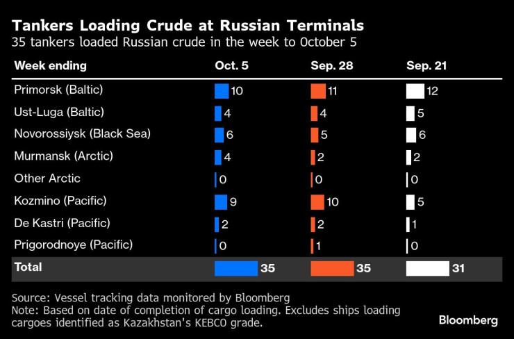 Согласно данным отслеживания судов и отчетам портовых агентов, за неделю до 5 октября 35 танкеров загрузили 27,17 миллиона баррелей российской сырой нефти. На предыдущей неделе объем превысил 26,75 миллиона баррелей на 35 судов.