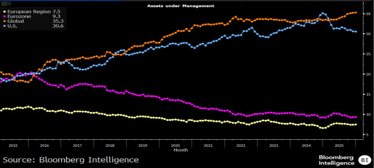Европейские инвесторы часто вкладывают больше средств в акции США, чем в свои внутренние рынки, либо напрямую, либо через глобальные ETF, ориентированные на Америку. Эта тенденция способствовала устойчивому снижению доли ETF, привязанных к европейским акциям.