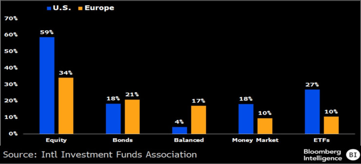 Предпочтение стабильности потенциалу роста, гарантированной доходности и низкой волатильности еще более очевидно в инвестиционных фондах, которыми уже владеют европейцы. Стратегии акций составляют всего 34% активов европейских фондов, в то время как фонды облигаций составляют 20%, фонды с несколькими активами 18% и фонды денежного рынка 9%.