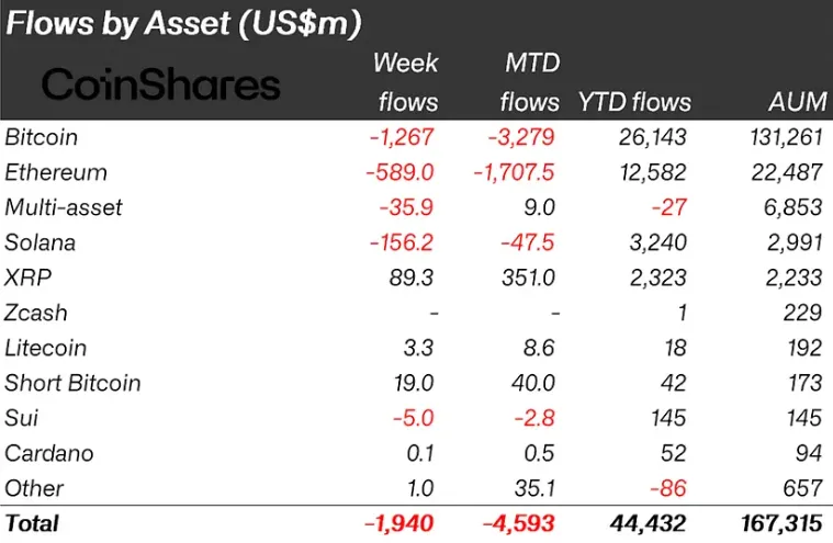 За неделю с 15 по 21 ноября общий отток средств составил $1,94 млрд. Больше всего пострадал биткоин — из продуктов на его основе было выведено $1,27 млрд. Инвесторы вывели $589 млн из фондов Ethereum. Солана показала худший результат среди альткоинов с оттоком $156 млн.