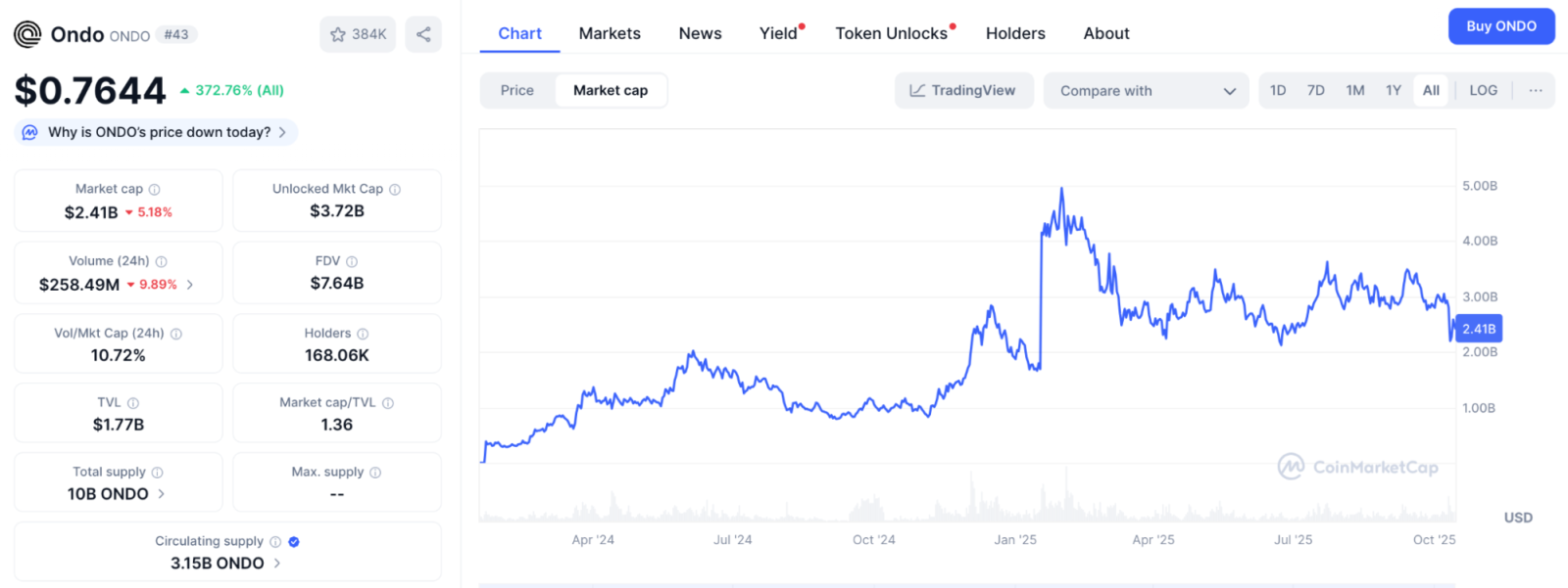 По состоянию на октябрь 2025 года рыночная капитализация ONDO составляет 2,4 миллиарда долларов, TVL — 1,77 миллиарда долларов, ежедневный объем торгов превышает 250 миллионов долларов, а количество держателей — более 168 000. Токен котируется на Binance, Coinbase, OKX и других крупных биржах.