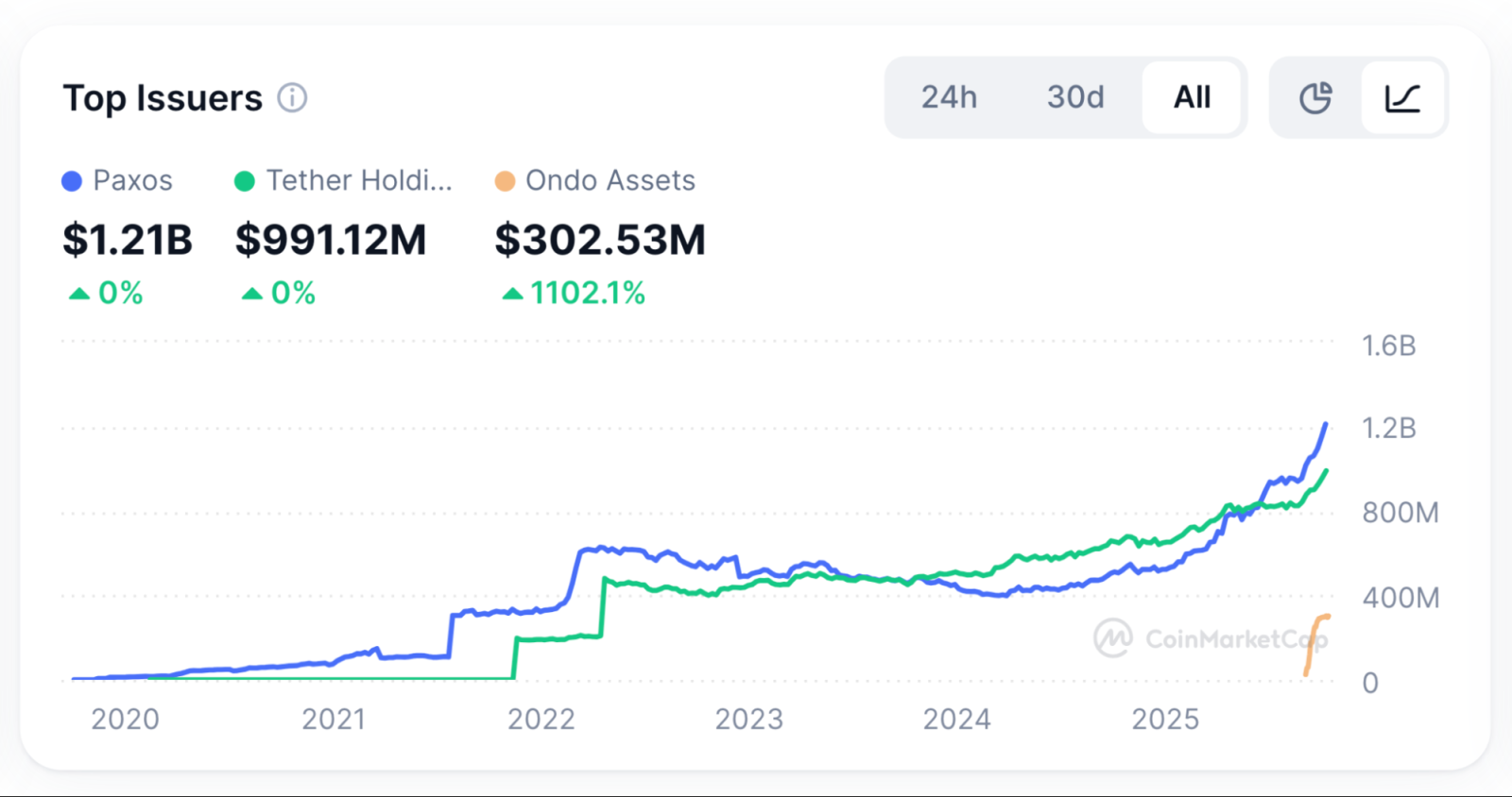 Наибольший спрос наблюдается по двум направлениям — казначейским облигациям (гособлигациям США) и металлам. Более 80% всего рынка формируют три эмитента: Ondo Assets, Paxos и Tether Holdings.