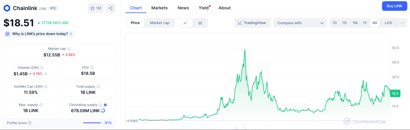 Он стоит один Звено цепи (ССЫЛКА) — не классический актив RWA, а ключевой технологический слой рынка. Именно его инфраструктура оракула обеспечивает проверку резервов, ценовых потоков и данных о соответствии, без которых не может функционировать ни один токен RWA. LINK также котируется на всех основных биржах и стабильно входит в топ-20 по капитализации.