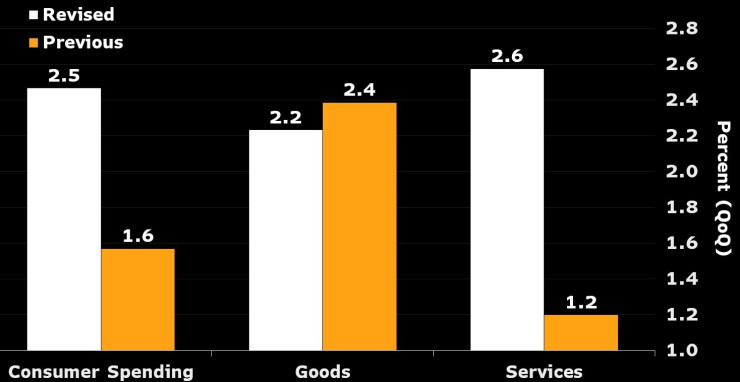 Потребительские затраты — основной двигатель экономического роста — увеличился на 2,5% на ежегодной основе. Вверх пересмотр отражает более высокие затраты на транспортные услуги, а также финансовые услуги и страхование.