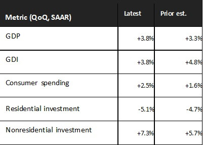 Валовой внутренний продукт, скорректированный с инфляцией, увеличился с пересмотренной годовой скоростью на 3,8%, согласно отчету Бюро экономического анализа, опубликованном в четверг. Это более сильный рост, чем предыдущий сообщил 3,3%, и после усадки в первом квартале.