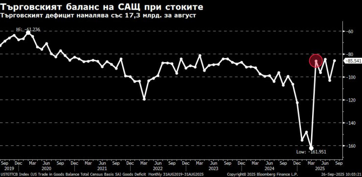 Дефицит торговли в США в товаре упал на 17,3 млрд. Долл. США по сравнению с предыдущим месяцем до 85,5 млрд. Долл. США в августе 2025 года, что значительно ниже ожиданий в размере 95,65 млрд долл. США. Импорт упал на 7,0% ежемесячно до 261,6 млрд. Долл. США. Напротив, импорт увеличился для других товаров (от 6,9% до 13,7 млрд. Долл. США) и автомобилей (от 1,7% до 34,5 млрд. Долл. США). В то же время, экспорт упал на 1,3% до 176,1 млрд. Долл. США, под влиянием снижения промышленных принадлежностей, потребительских товаров и автомобилей (от -3,0% до 12,7 млрд. Долл. США), что частично компенсирует рост капитала (от 1,1% до 60,6 млрд. Долл. США), а также продукты питания и напитки.