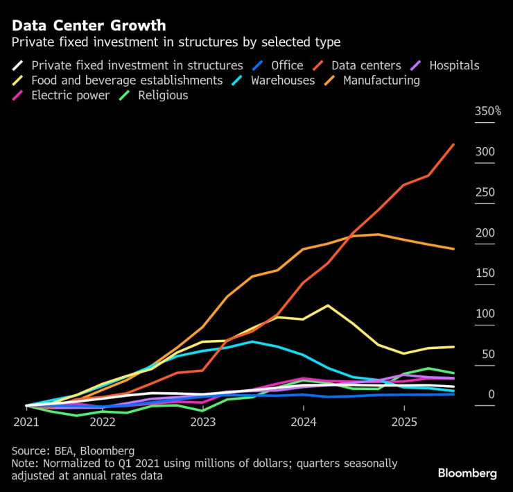 Конечно, этот быстрый рост обусловлен небольшой базой: как доля экономики, инвестиции в центры обработки данных все еще невелики, что способствует приблизительно 3 основным точкам для роста ВВП в первой половине 2025 года в целом, Bloomberg Economics оценивает, что все виды деятельности, связанные с искусственным интеллектом (не только центрифы) ВВП в первой половине года.