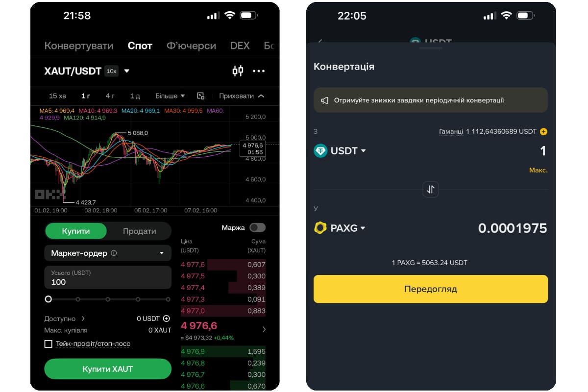 Классические способы покупки золота в Украине часто основаны на процедурах. Банковское золото — это филиал, документы и регламент, а покупка через брокера требует наличия аккаунта, верификации, иногда дополнительных требований и не самого простого пополнения. Токенизированное золото в этом смысле проще: его можно купить онлайн через криптобиржу или кошелек, зачастую с обычной карты любого украинского банка.
