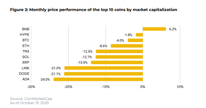 Октябрь ознаменовался снижением общей капитализации криптовалют на 6,1%, это первый негативный октябрь с 2018 года. Коррекцию спровоцировала исторически крупная ликвидация на $19 млрд 10 октября. Об этом говорится в ежемесячном обзоре рынка Binance Research, аналитического подразделения криптовалютной биржи Binance.