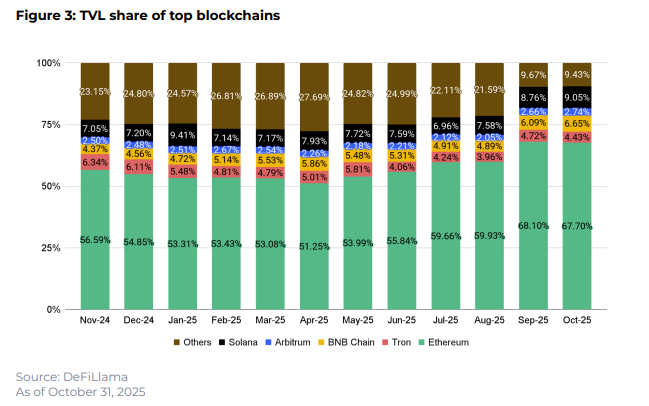 USDT продолжает расширять свое доминирование над USDC. В октябре появились новые стейблкоины, обеспеченные фиатной валютой: EUROD (привязанный к евро) и JPYC (привязанный к японской иене), что расширяет разнообразие стейблкоинов за пределами доллара США и повышает эффективность международных платежей.