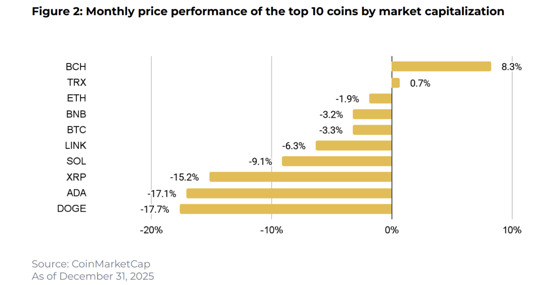 - DOGE (-17,7%) стал наиболее заметным падением среди 10 крупнейших активов в декабре.