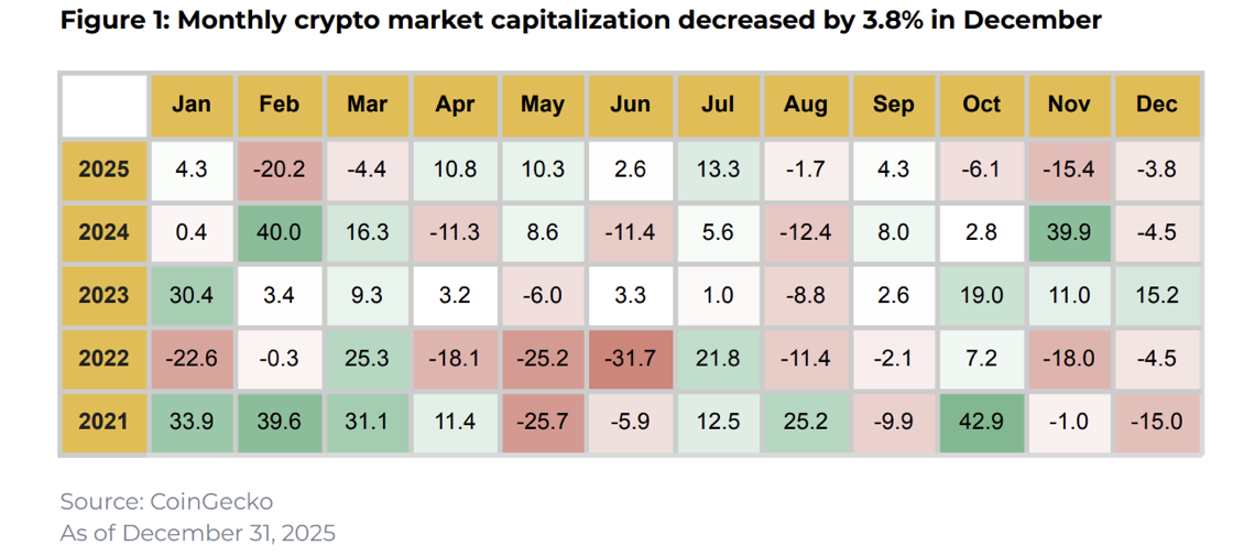 Binance Research отмечает, что в декабре продолжилась коррекционная динамика, при этом структура рынка стала более «защитной»: доминирование BTC и ETH усилилось, компании, владеющие цифровыми активами, продолжали накапливать, а динамика потоков ETF подчеркнула диверсификацию спроса в пользу отдельных альткойнов за счет новых продуктов.