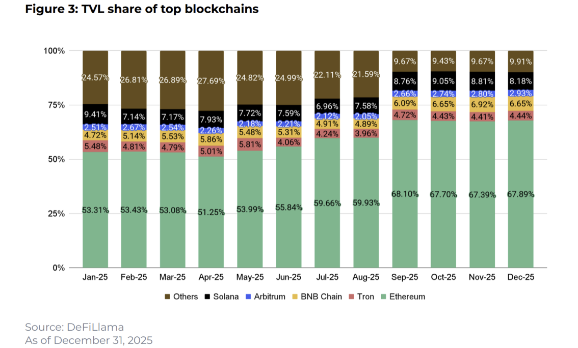 В декабре сегмент DeFi умеренно снизился: Total Value Locked (TVL) снизился на 1,76% м/м. Что касается крупнейших экосистем, Binance Research отмечает увеличение доли некоторых сетей (включая Ethereum, Tron и Arbitrum), тогда как доля некоторых других несколько снизилась.