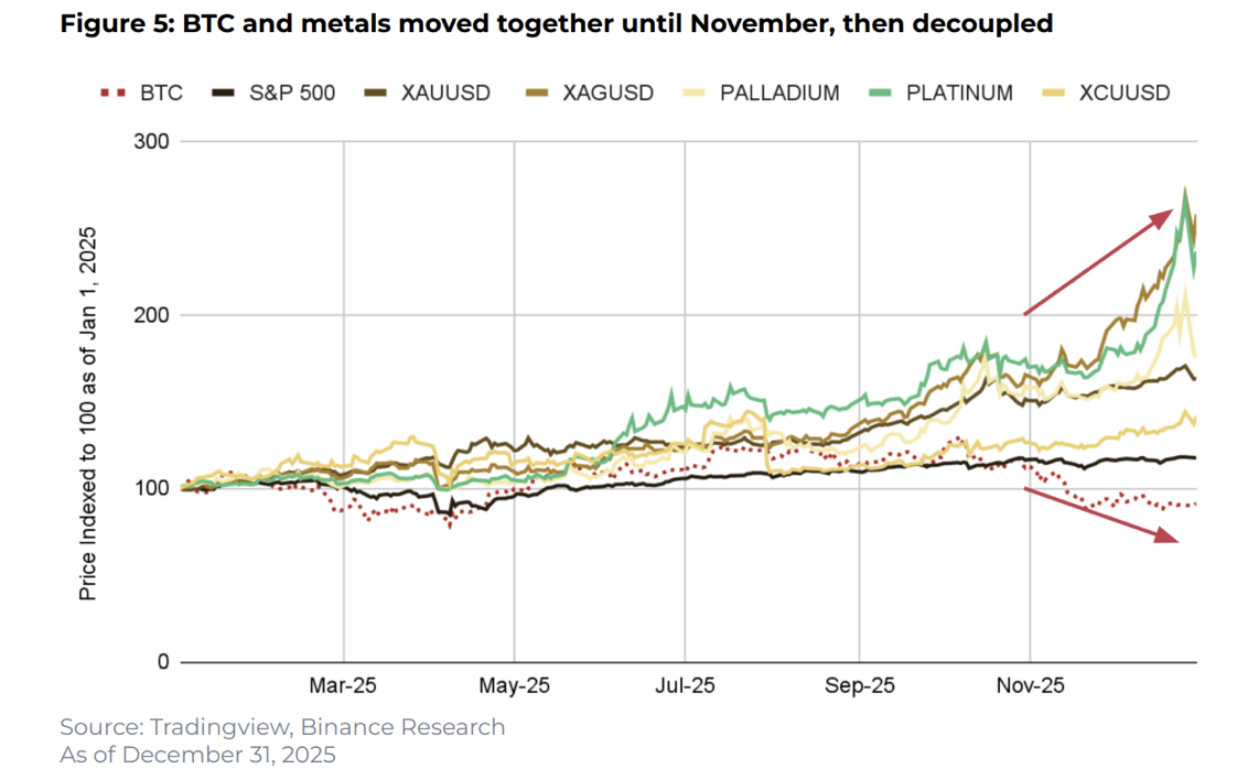 На этом фоне Биткойн в IV квартале, по наблюдению команды, отошел от этой логики из-за отсутствия «Стратегической премии за активы» (поддержки на уровне суверенных решений), которая теперь в большей степени поддерживает физические товары.