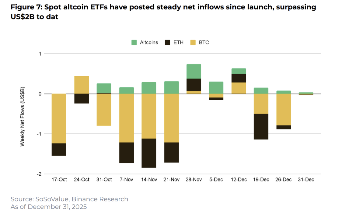 По данным Binance Research, с октября спотовые ETF BTC и ETH демонстрируют стабильный еженедельный чистый отток, в то время как новые ETF альткойнов в основном регистрируют положительный приток.