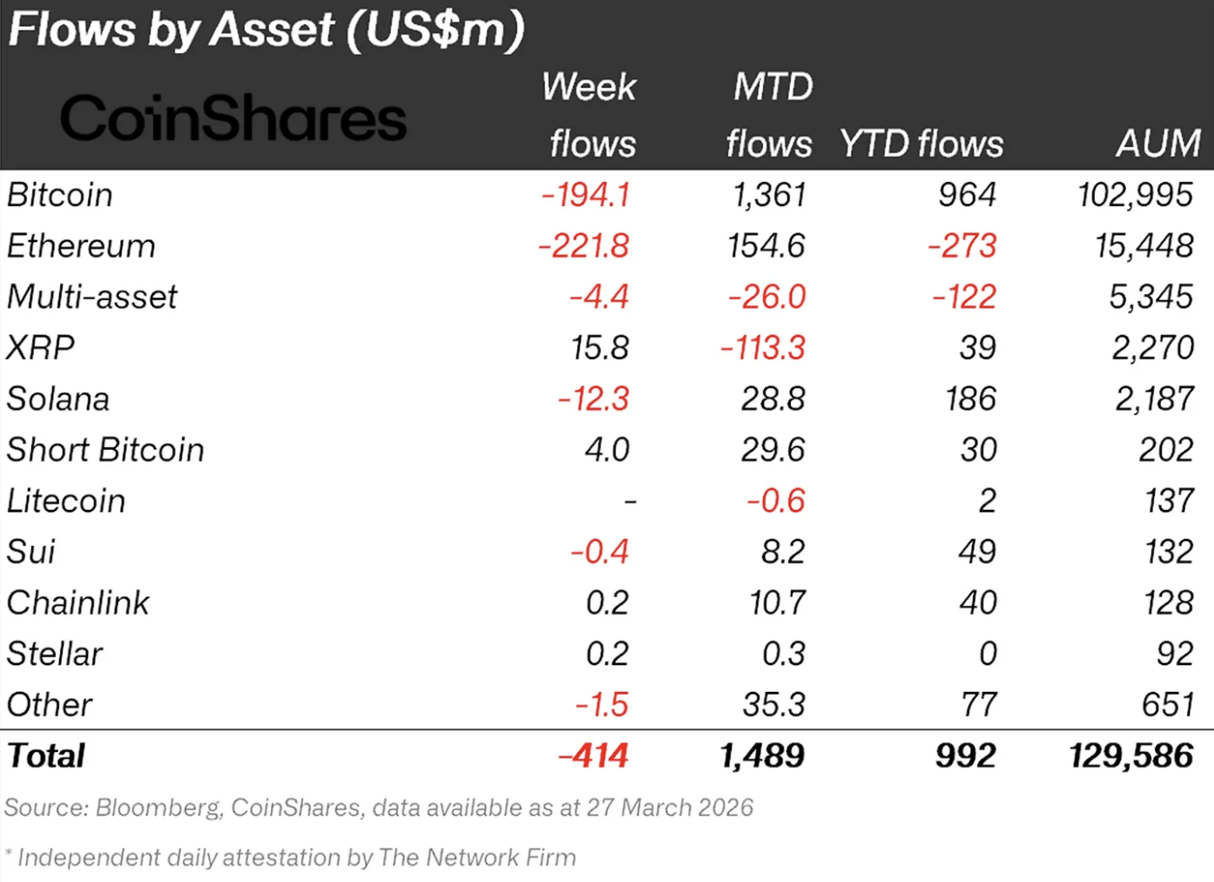 После четырех недель уверенного роста рынок криптоинвестиционных продуктов продемонстрировал негативную динамику. За период с 23 по 27 марта отток капитала составил $414 млн. Об этом свидетельствуют данные отчета CoinShares.