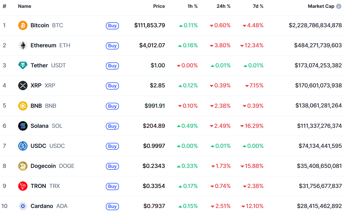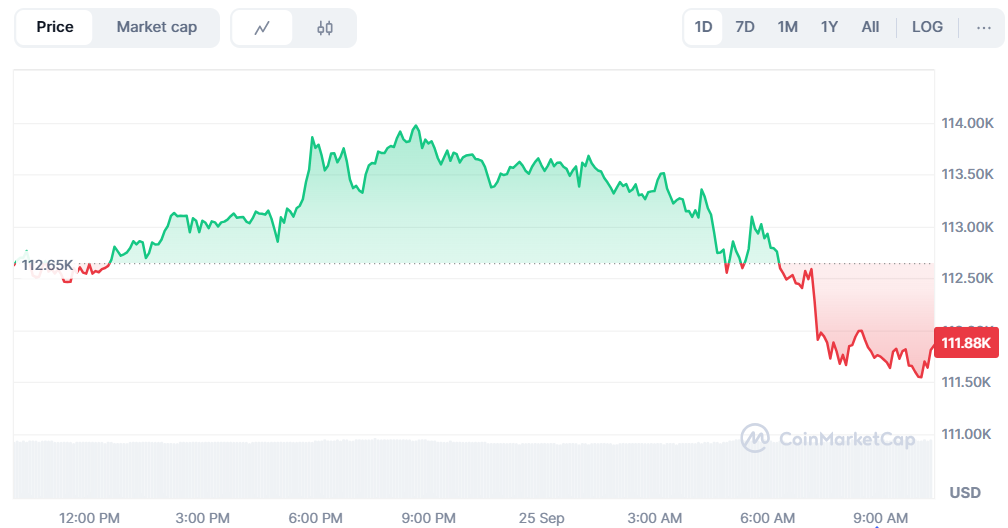 Утром 25 сентября рынок криптовалют снова испытывает коррекцию. Ставка биткойнов снизилась ниже 112 000 долл. США, а Ethereum ниже 4000 долл. США ниже. CoinmarketCap подтверждается этим.