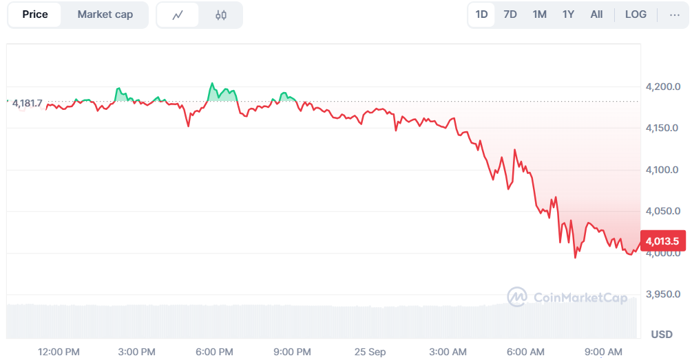 В настоящее время Ethereum снизился до 3993 долл. США, но затем увеличился до 4 012 долл. США. Актив терял 3,80%в день, 12,34%в неделю.