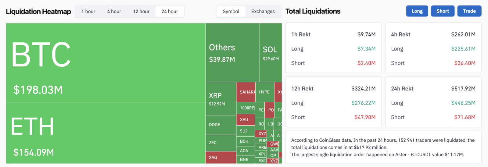 По данным CoinGlass, суточный объем ликвидаций по фьючерсам на криптоактивы превысил $517 млн. В результате принудительного закрытия позиций пострадали более 152 тысяч трейдеров. Наибольшие потери зафиксированы в операциях с биткоином и Ethereum. В то же время основная часть ликвидаций пришлась на длинные позиции.