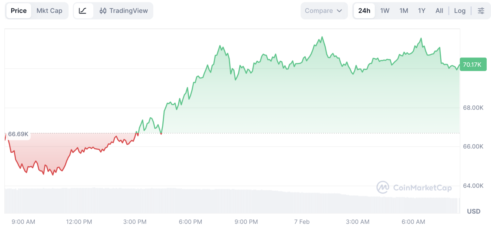 На момент написания цена первой криптовалюты достигла $70 175. За последние 24 часа актив прибавил 6,68%. Однако недельное падение составляет почти 16%. Обратите внимание, что в октябре 2025 года Биткойн достиг своего пикового значения в 126 080 долларов.
