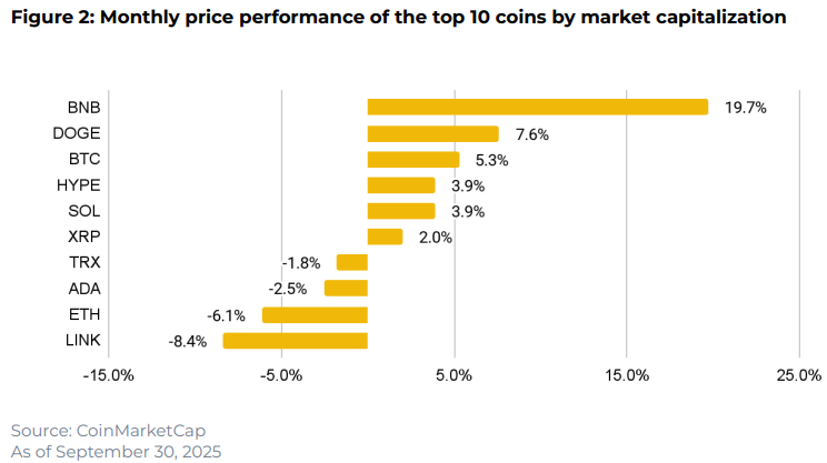 Среди актуальных активов по итогам месяца оказались BNB (+19,7%), Doge (+7,6%) и BTC (+5,3%). Рост BNB способствовал рекордным объемам торгов на Aster Dex и расширению платформы Benji Investments от Франклина Темплтона в сети BNB.