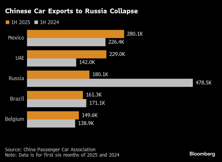 В конце 2024 года Москва начала увеличивать «плату за переработку» на импортируемых транспортных средствах, что привело к увеличению цены на автомобили с одним или двумя или двухлитрами двигателями с эквивалентом более 8000 долларов. Между тем, высокая стоимость кредитов была тяжелой для потребителей, что привело к продажам автомобилей в России на 27% в первой половине года. Импорт китайских автомобилей упал на 62% за тот же период.