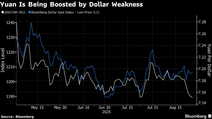 Настроение инвесторов поддерживается ожиданиями устойчивой прибыли от акций накануне парада 3 сентября, посвященного Дню победы, что приводит к притоке капитала, который поддерживает юань. Доллар упал после того, как председатель Федеральной резервной системы Джерома Пауэлла в Джексон -Хоуле на прошлой неделе дал сигнал о возможном снижении процентных ставок уже в сентябре.